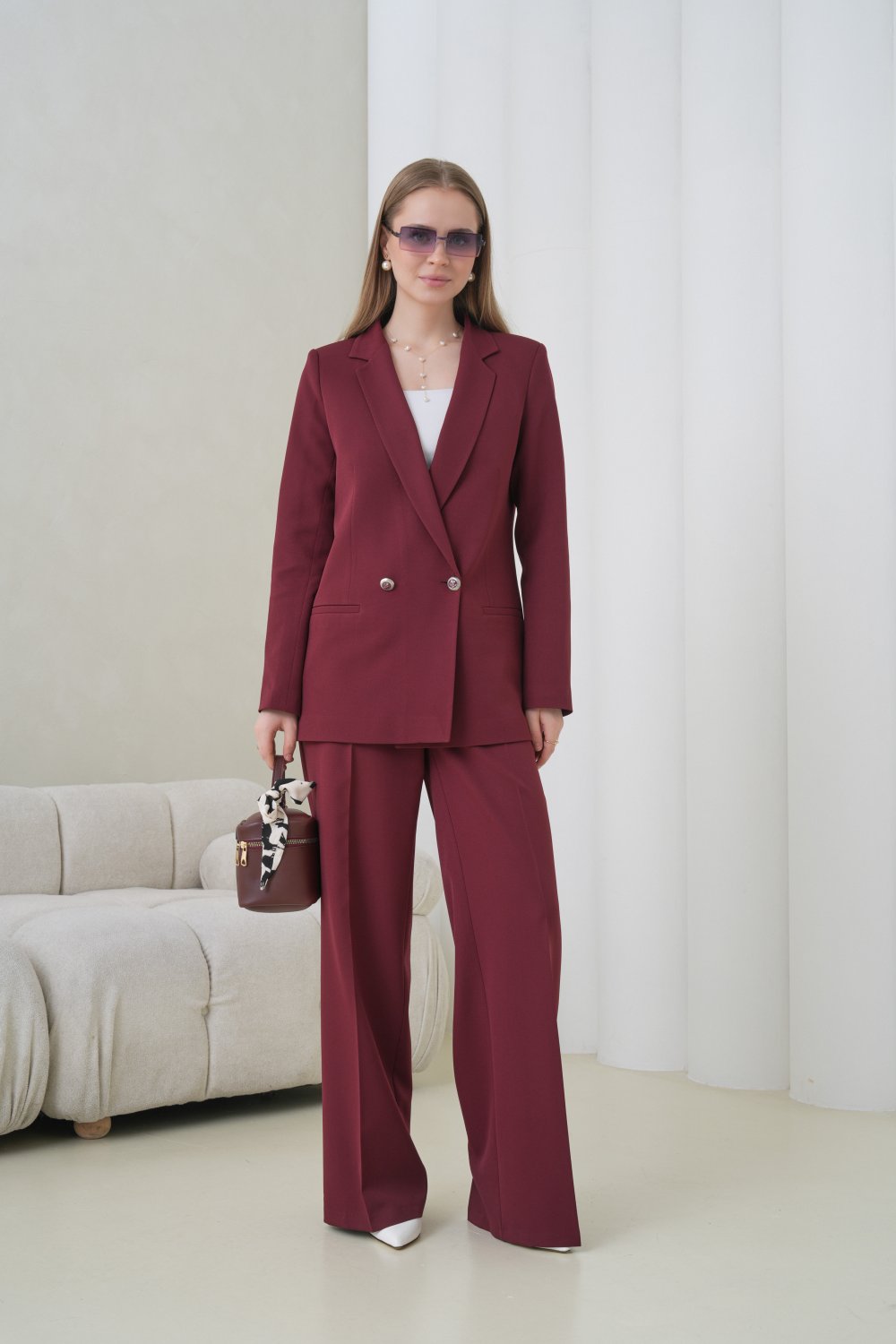 Çift Düğmeli Salaş Kadın Takım Elbise Bordo