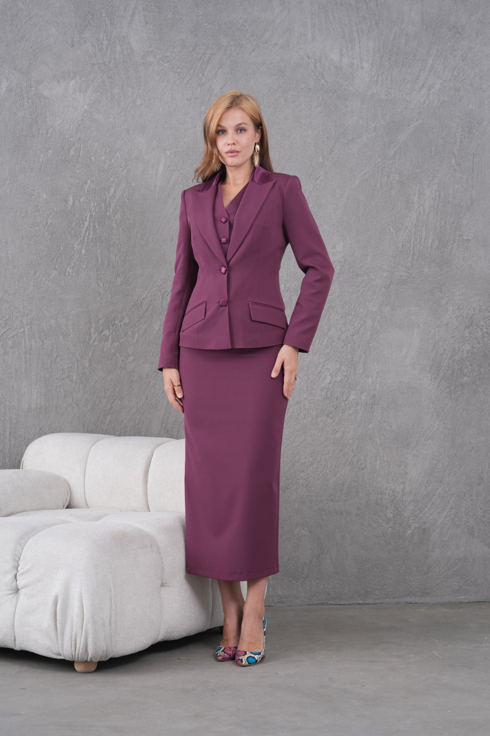 Kare Düğmeli Üçlü Kadın Takım Elbise Mürdüm