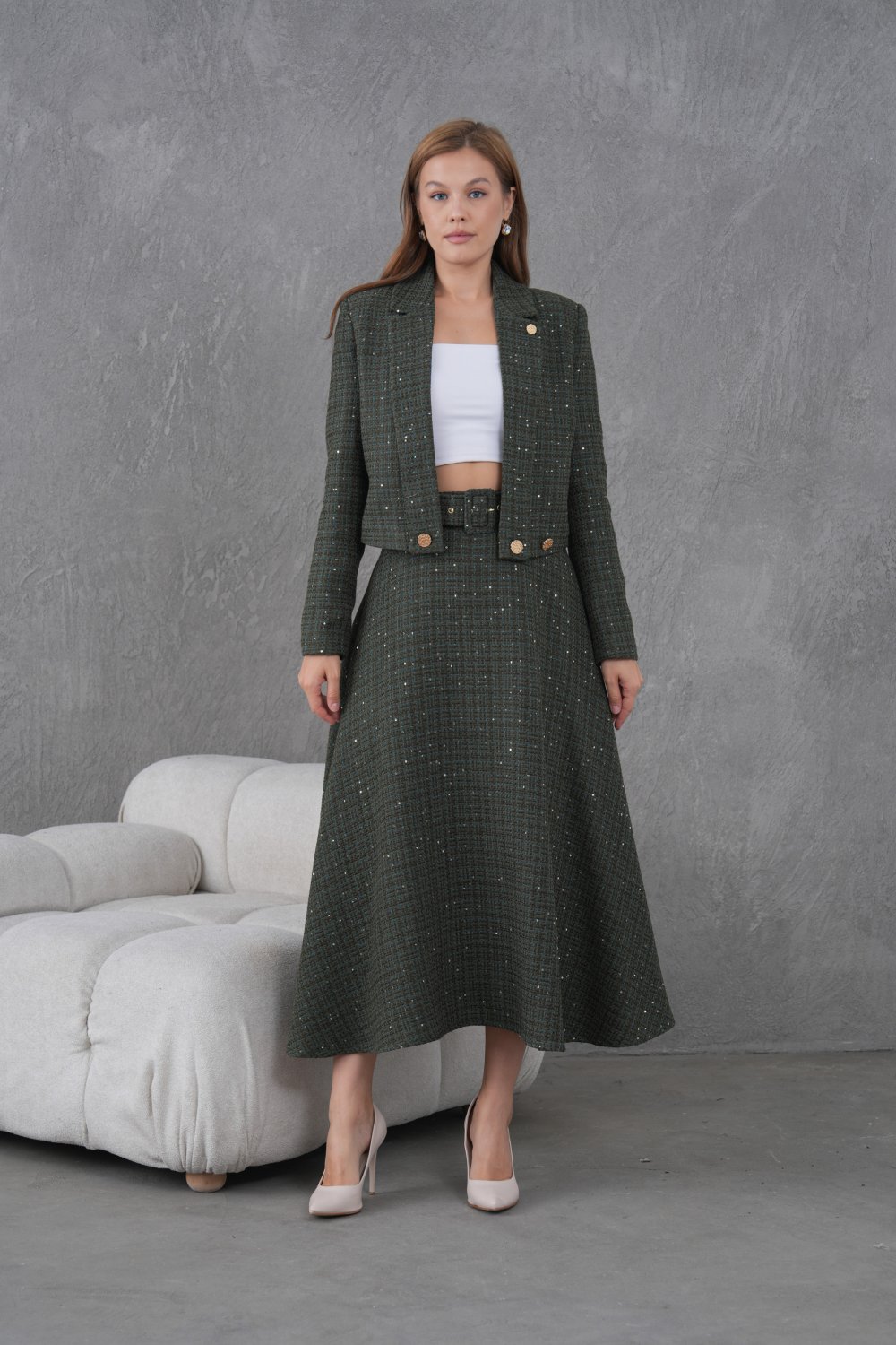 Örgü Kumaş Kloş Etekli Kadın Takım Haki