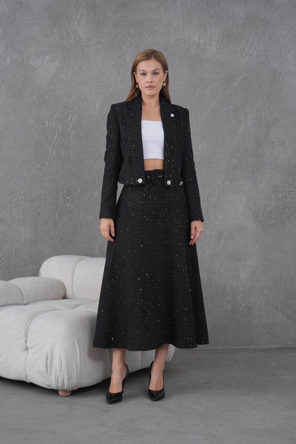 Örgü Kumaş Kloş Etekli Kadın Takım Siyah